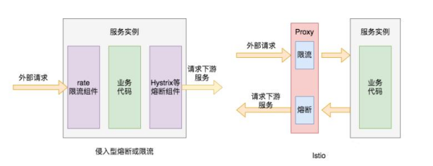 如下图右侧所示,当外部请求调用服务实例接口时,其发送的网络请求会经过它们各自的网络代理,那么代理就可以为其提供服务熔断相关的机制,当调用服务实例持续出错时,就不再将外部请求发送到服务实例,而是直接返回配置的错误码。同样,Proxy代理可以为其提供限流功能,当外部请求流量过大时,代理会对其中一部分请求进行限流,拒绝部分请求,只将部分请求转发下游服务。