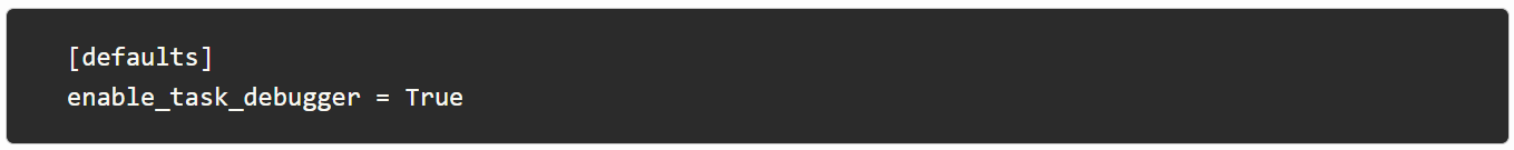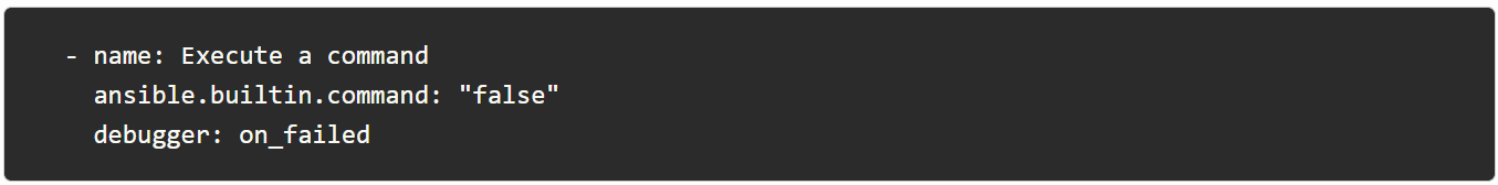 您必须启用调试设置,默认情况下是关闭的。接下来,您可以使用 debugger 关键字,如Ansible 文档中的此示例 所示:
