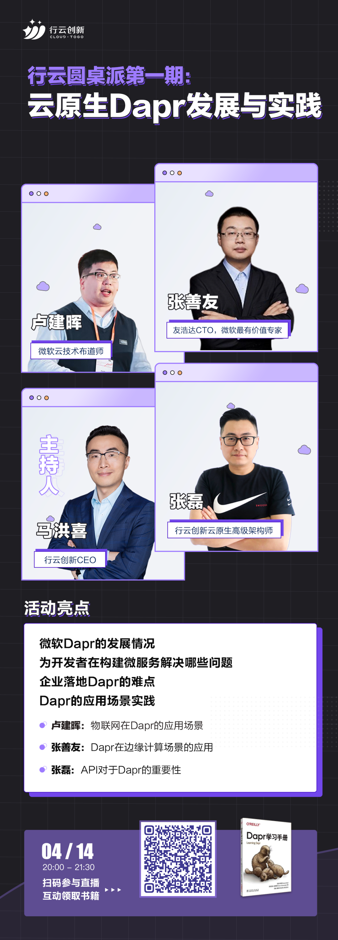 4月14日晚上8点,《行云圆桌派第一期:云原生Dapr的发展与实践》直播来啦!活动由yabo亚博创新CEO马洪喜,微软最有价值专家、.NET技术专家张善友,微软云技术布道师卢建晖,yabo亚博创新云原生架构师张磊四位嘉宾与大家聊聊Dapr的发展情况和落地遇到的问题、Dapr应用场景实践、未来展望等。