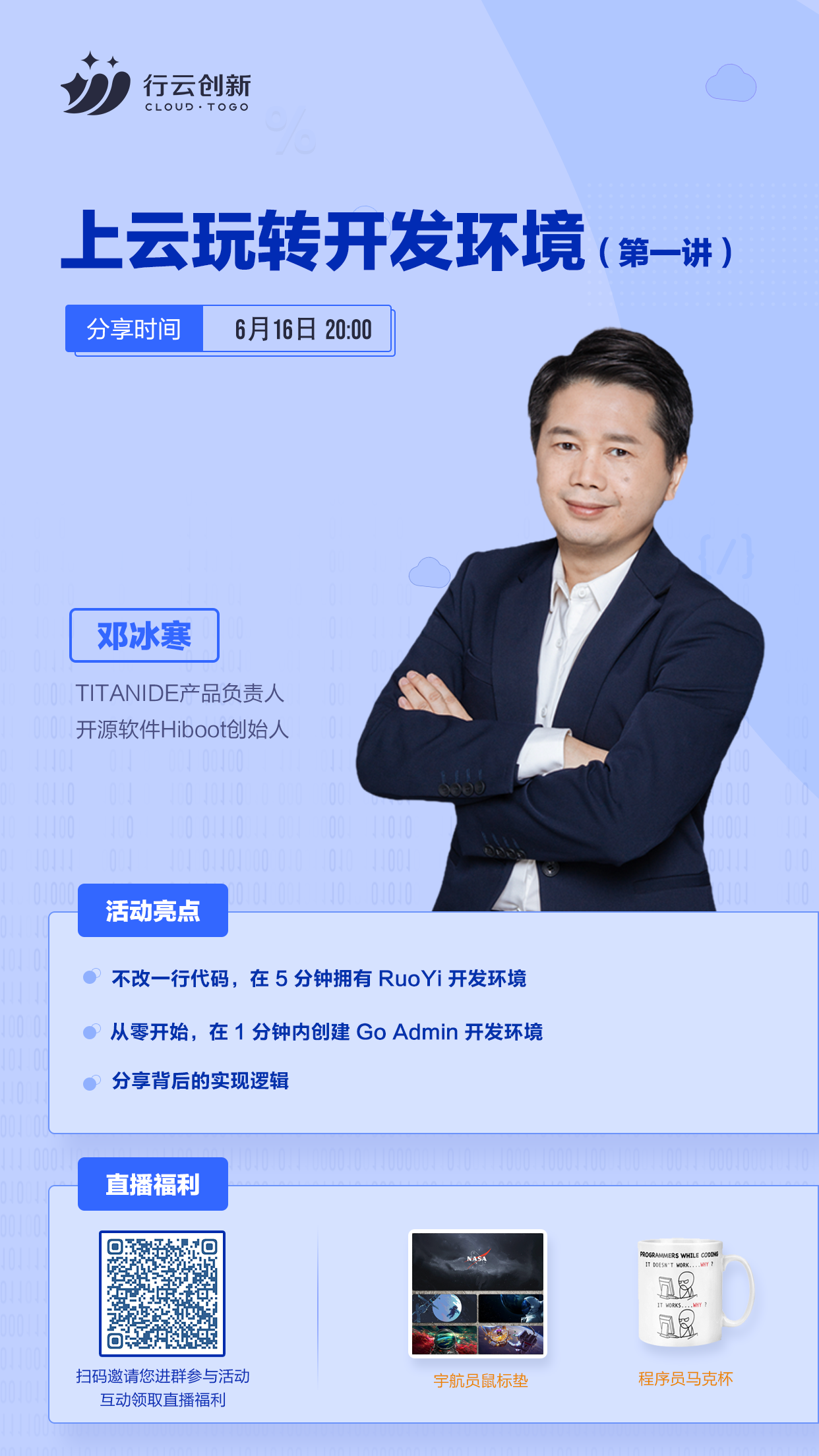 6月16日20:00,“上云玩转开发环境”第一讲即将开启!yabo亚博创新 TitanIDE 产品负责人邓冰寒将分享:如何利用 TitanIDE 在不改一行代码情况下,在5分钟拥有 RuoYi 开发环境;如何从零开始,在1分钟内创建 Go Admin 开发环境;以及分享这背后的实现逻辑。直播间还会送出宇航员鼠标垫、程序员马克杯等福利,快扫码参与活动吧~
