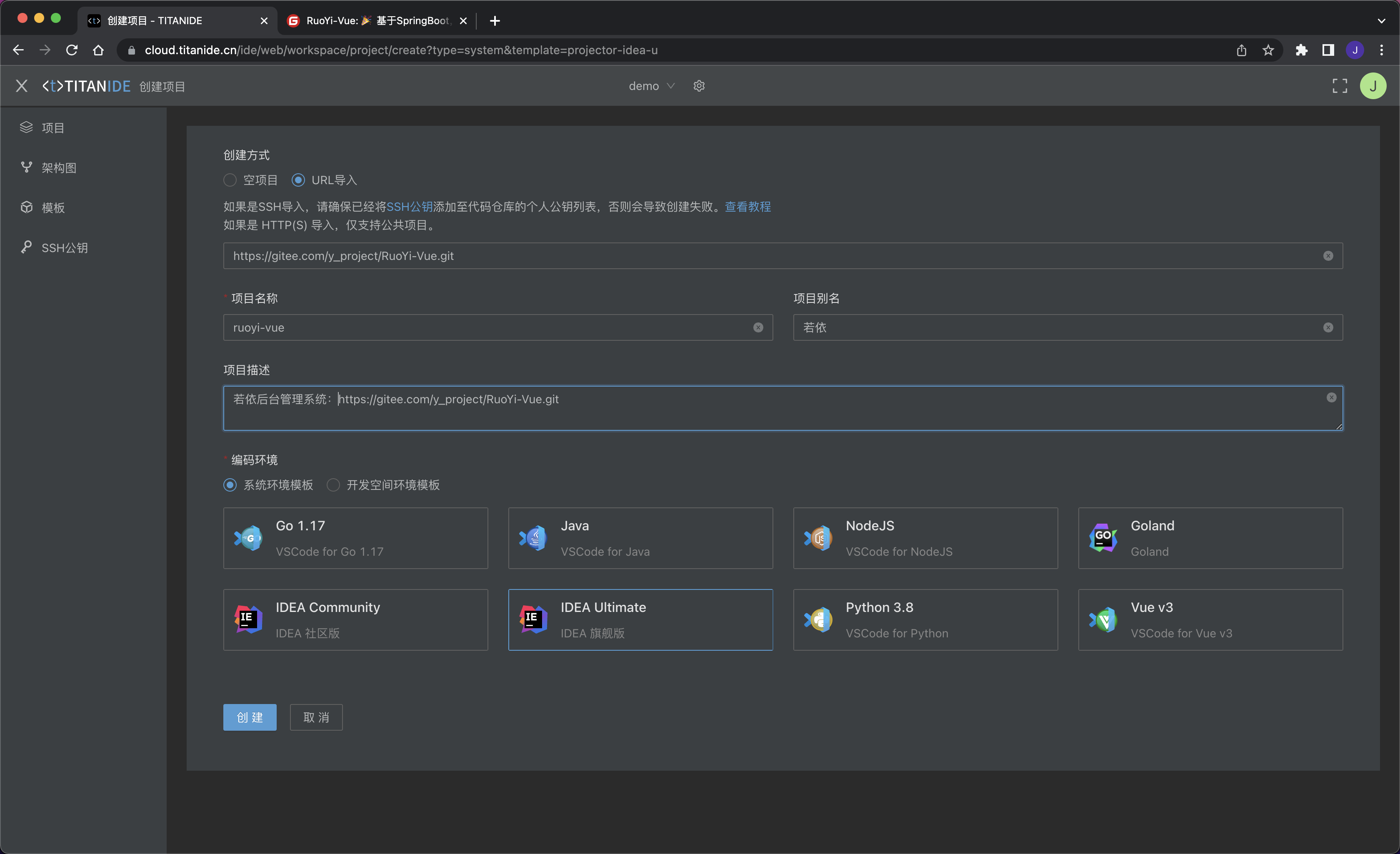 https://github.com/yangzongzhuan/RuoYi-Vue.git),通过创建 URL 导入的方式创建 TITANIDE 项目。