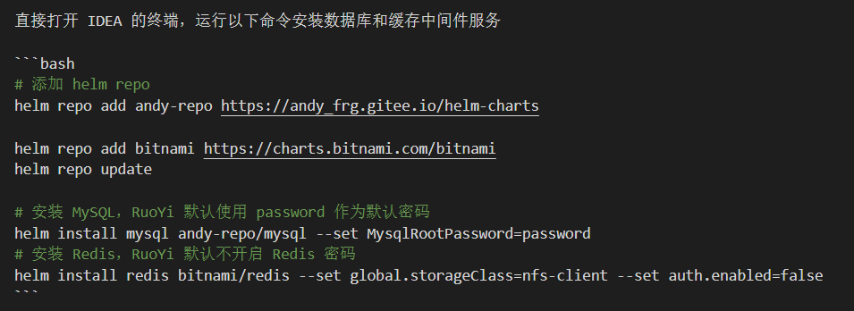 直接打开 IDEA 的终端,运行以下命令安装数据库和缓存中间件服务