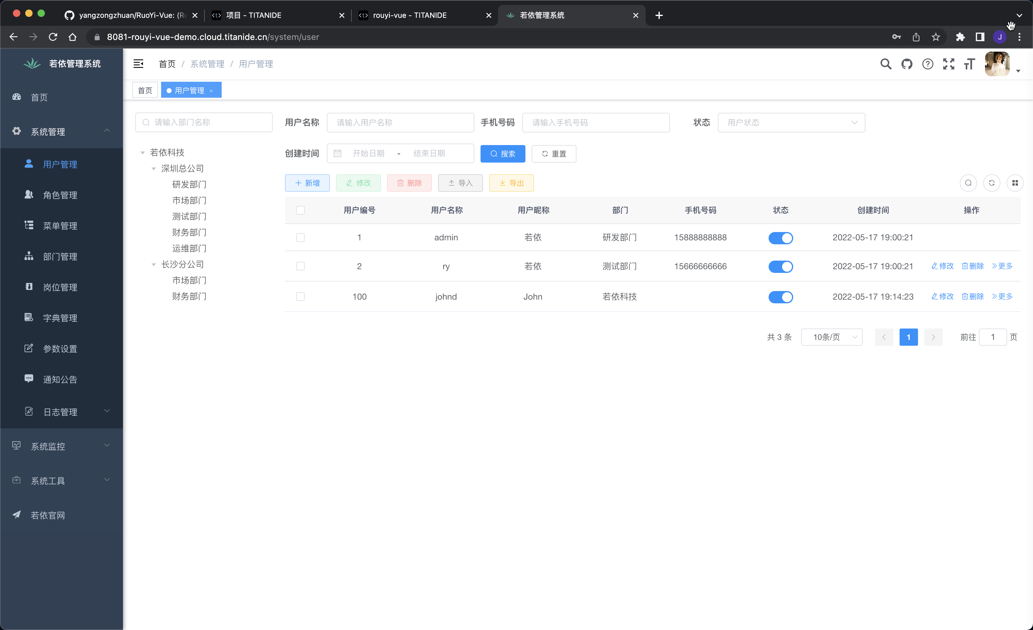 若依(RuoYi)是一个后台管理系统,基于经典技术组合(Spring Boot、Apache Shiro、MyBatis、Thymeleaf)主要目的让开发者注重专注业务,降低技术难度,从而节省人力成本,缩短项目周期,提高软件安全质量。